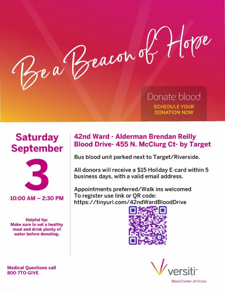 Alderman Reilly is hosting a Blood Drive on Saturday, September 3rd, from 10:00 a.m. to 12:30 p.m. The event will be held at 455 North McClurg Court.